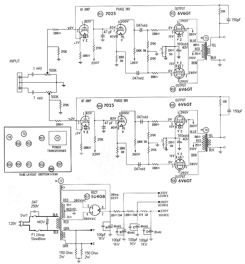 The schematic – with some bias and output mods – not showing the power supply or output tube modifications – that I’m basing the design is here (click for larger version!):
