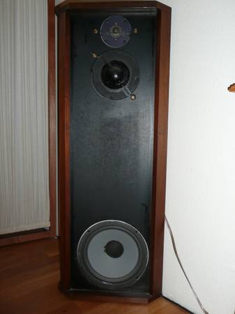 These have been on Craigslist a few times in the local area in the last year. It looks like they’ve changed hands since the last time, and the price is considerably higher. These have the 15″ woofer inside the folded horn and an Electro-Voice tweeter, but feature a 6.5″ midrange driver instead of a midrange horn. I believe this was the last year Speakerlab sold the corner horn design, which had moved away from the Klipsch-inspired design of the Speakerlab K.