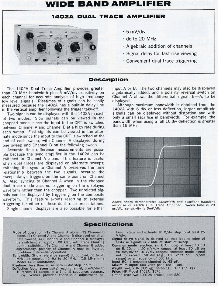 I’m primarily interested in the 1402A dual-trace vertical amplifier, as I already have one, but will consider purchasing any of the other 1400-series amplifier and time-base plugins.