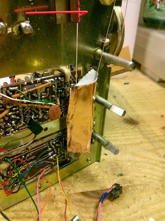 Copper shielding tape is an extremely important part of an electronics test bench. It’s very handy to shield a sensitive part of a circuit from electrical interference, but also, it can shield from thermal interference as well! In this case, because the copper foil is a thin piece of metal with a high melting point, the soldering iron brushing up against the foil won’t damage the string under it, and won’t heat it up nearly enough to cause damage to anything underneath for a short tap. This is the perfect solution to the problem of dial strings snapping when trying to solder too close to them. Copper shielding tape can be soldered, so it’s perfect to provide some protection against an errant soldering iron. A small 2″ section wrapped around itself with only a small section of the adhesive removed to form a cylinder was all it took.
